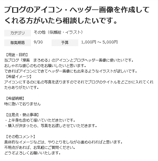 ここから自分が欲しいものやサービスを書いておくと興味を持った人が提案してくれるのでその人たちから自分がいいなと思った人に依頼すればいい。